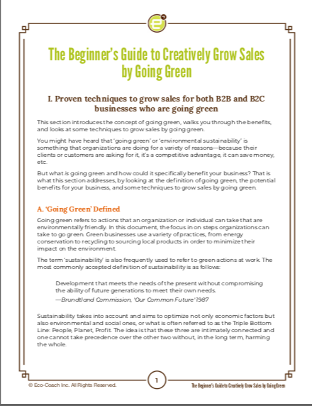 Learn why going green or 'environmental sustainability' is KEY to growing your B2B or B2C business and ensuring long-term financial success. Choose from 50+ low-cost, simple actions to take to grow trust and goodwill towards your brand, and attract new customers or clients. Select from proven techniques to grow sales via going green.